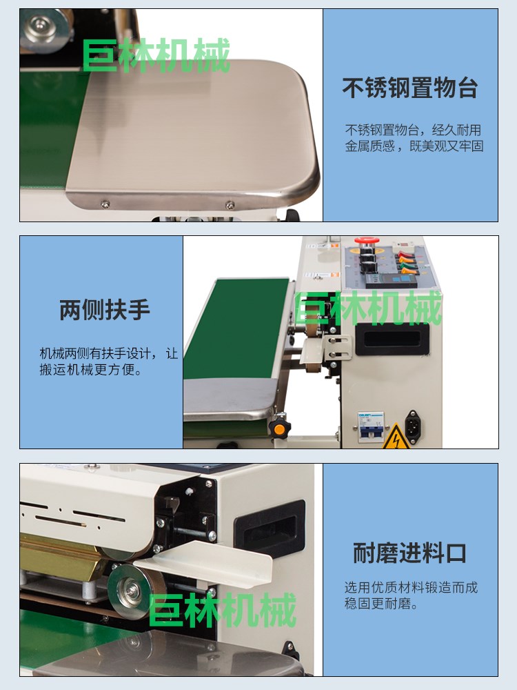本機是新一代集印碼,封口,連續輸送為一體的自動薄膜封口機,具有印字清晰、顔色可選、即印即干、換字方便等特點。